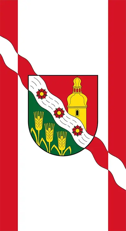 Das Gemeindewappen ist beidseitig aufgedruckt. An der oberen Fahnenseite ist ein Hohlsaum.